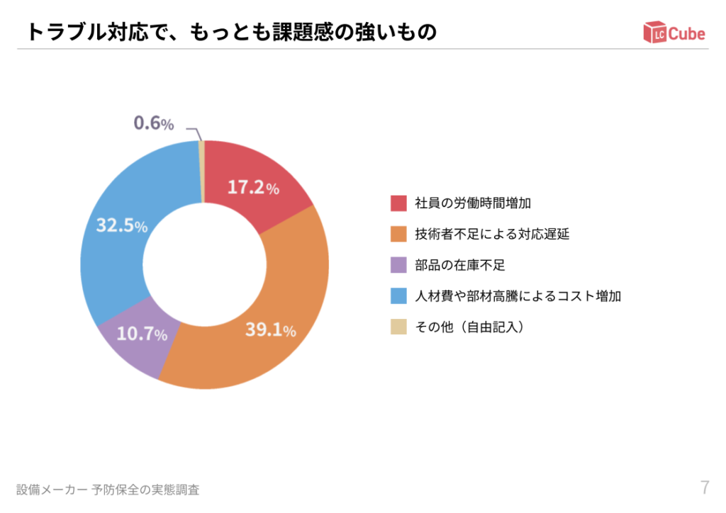 「トラブル対応で、もっとも課題感の強いもの」について質問したところ、回答の多い順に、技術者不足による対応遅延(39.1%)、人材費や部材高騰によるコスト増加(32.5%)、社員の労働時間増加(17.2%)、部品の在庫不足(10.7%)の結果となりました。
