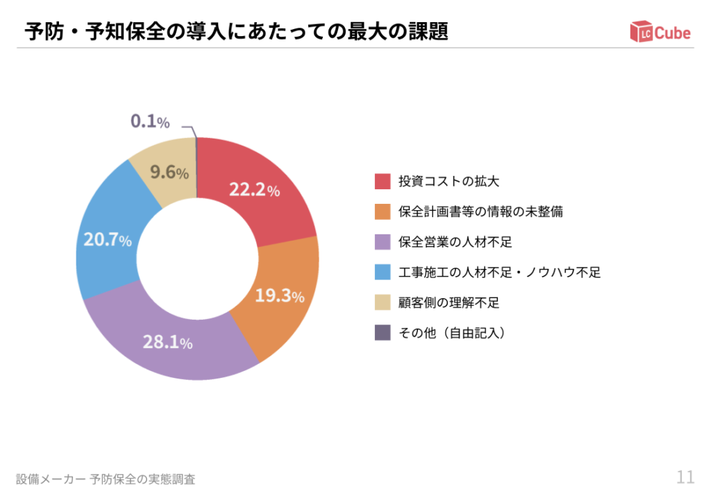 「予防・予知保全の導入にあたっての最大の課題」は何か質問したところ、回答の多い順に、保全営業の人材不足(28.1%)、投資コストの拡大(22.2%)、工事施工の人材不足・ノウハウ不足(20.7%)、保全計画書の情報の未整備(19.3%)、顧客側の理解不足(9.6%)の結果となりました。